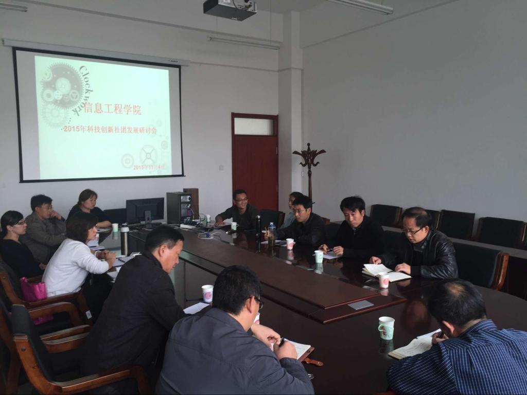 公司于2015年11月4日下午,在F203会议室召开科技创新社团发展研讨会,李宝山书记,江杰教授、段志峰副书记以及各社团负责人、学工办全体老师参加会议。科技创新社团为老员工提供了实践锻炼的平台,科技创新社团的发展也是公司联系我们的重点之一。