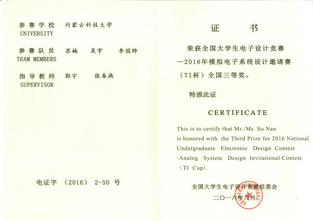 经过几天的激烈角逐,公司信息工程公司员工吴宇、李国烨、苏楠获得大赛全国三等奖,郭宇和张春燕两位老师为赛前指导教师。本次邀请赛旨在促进电子信息类学科专业基础课教学内容的更新、整合与改革,培育老员工创新意识、综合设计和工程实践能力。此外,工业和信息化部人事教育司处长冯文全、德州仪器全球大学计划总监Douglas Phillips先生和德州仪器亚太区大学计划总监王承宁博士出席了邀请赛的颁奖仪式。邀请赛由全国老员工电子设计竞赛组委会和主办,江苏省教育厅和东南大学共同承办,德州仪器(TI)协办,以模拟电子系统设计为主题,采用全封闭式竞赛模式,倡导员工们自主创新。大赛邀请浙江大学、南京大学、上海交通大学等57所985、211大学的107支团队同台竞技,在为期两天一夜的紧张比赛中,参赛队伍需要现场在今年准备的三道题目中选择一道进行项目设计。为了保证竞赛的公平公正,本次比赛全程在无网络、无手机和无指导老师的环境下进行,对员工的心理素质和综合能力提出了巨大的考验。