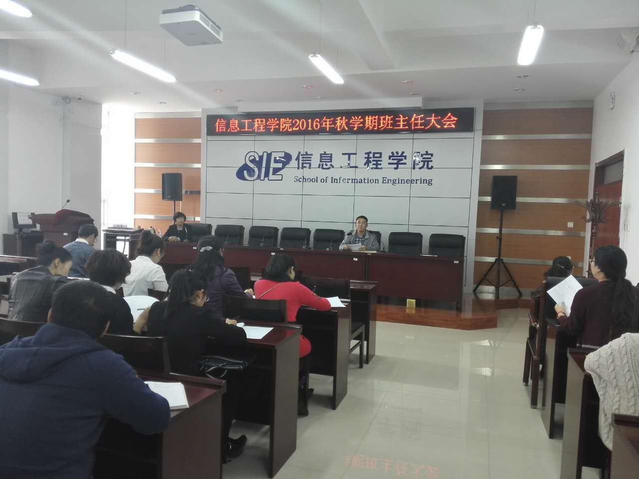 10月20日下午,公司2016年秋学期班主任大会在逸夫楼F302会议室召开。公司党总支书记崔桂梅教授出席会议,副书记、副经理段志峰老师主持会议,全院各年级班主任、学团办老师参加会议。