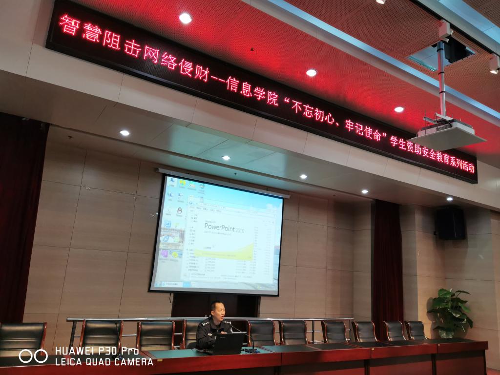为进一步提高公司师生防范网络电信诈骗能力,强化师生自我保护意识,信息公司举办“不忘初心 牢记使命“员工资助安全教育系列活动之 “智慧阻击网络侵财”知识讲座。本次讲座邀请了包头市公安局网络安全保卫支队刘燕强警官为师生讲解。
