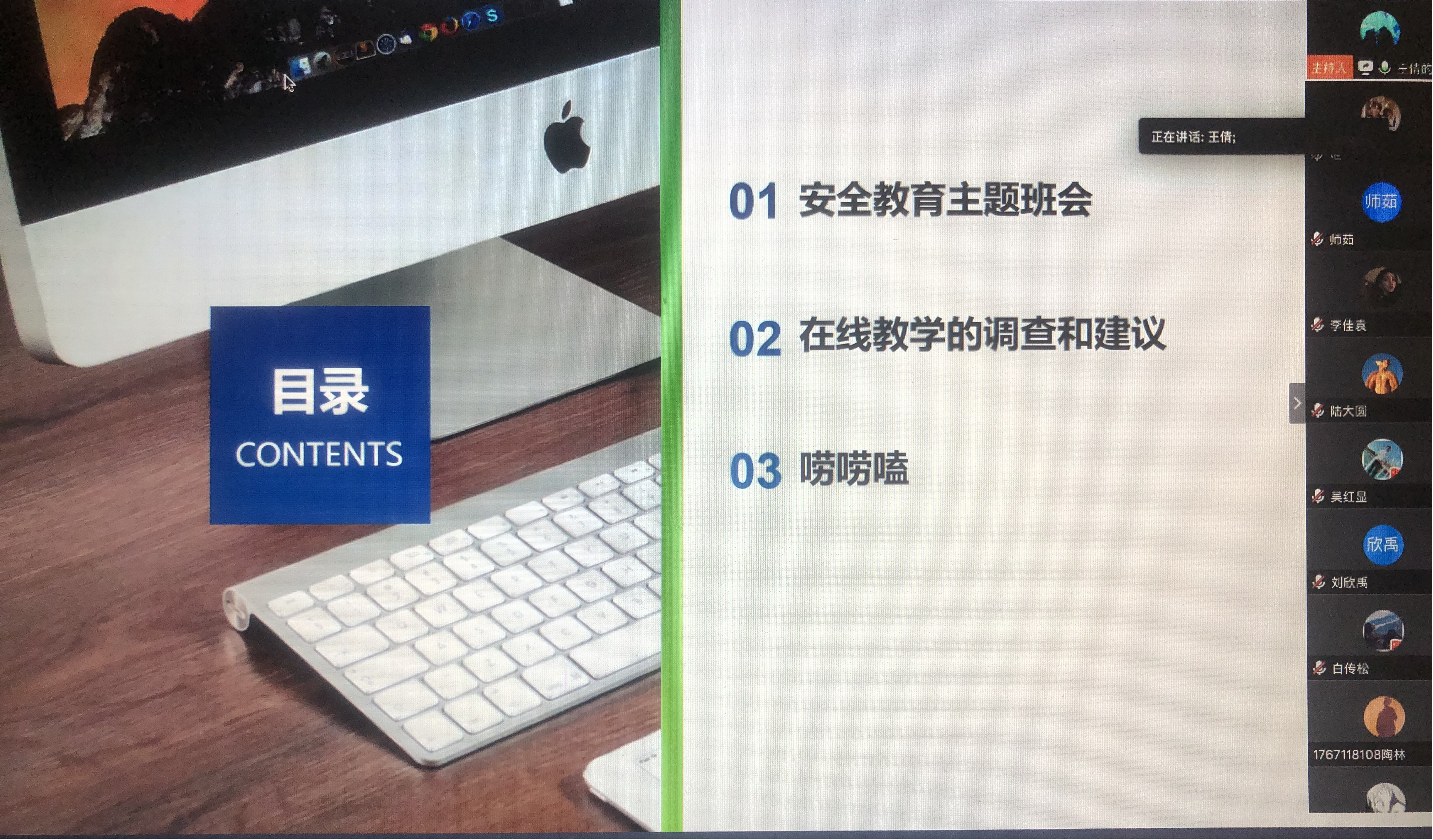 除了给员工们传达安全教育相关的主要内容,几个月没见的老师同学们也通过网络进行了交流和沟通,同学们汇报了在家的学习和生活状况,老师们叮嘱在疫情期间的个人防护注意事项,表达了对同学们的关心和关爱。