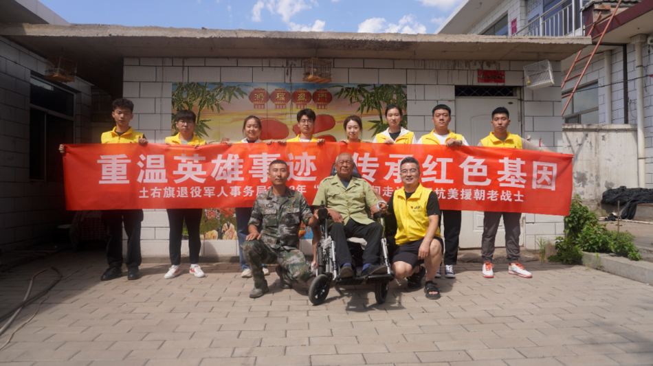 下午 ,实践队前往美岱召镇何家圐圙村走访慰问94岁高龄的抗美援朝老兵余来红。 余来红老人13岁就参加革命工作,曾参加过抗美援朝战争,是国家的功臣、民族的脊梁。实践团队带着慰问品来到老人家中,围坐在余来红老人身边倾听老兵讲述抗美援朝的峥嵘岁月。在抗美援朝战争中,余老军人作为一名通讯兵,为部队战士们提供敌军的情况,为避免被敌军发现,传信的纸条常含在口中,白天伏在山中,晚上才能行动,经常是随意吃一口饭就要继续侦查情况,不能睡觉休息,一刻也不敢松懈,老人通过讲述自己亲身经历,将大家带进了那段余红来老军人在抗美援朝战场上为同志们传递消息的光荣历史,生动地向队员们展现了先辈们忠诚于党、不屈不挠、无私奉献、保家卫国的伟大革命精神,动人的故事引起了队员们内心强烈的共鸣,纷纷向老兵致以崇高的敬意。
