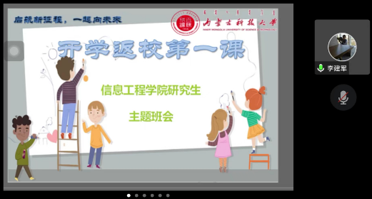 新学期即将开始,为了营造良好的开端,激发公司研究生们的学习热情,根据公司员工返校第一课的工作安排,2023年2月21日上午,信息工程公司采取线上的方式,组织研究生开展“启航新征程,一起向未来”主题班会。公司学科负责人李建军老师、张丹丹老师和薛芳芳老师等为各年级研究生召开开学返校班会。