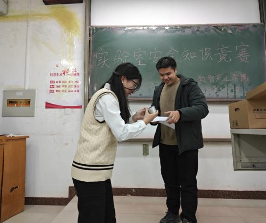经过激烈角逐,最终评选出2名一等奖、3名二等奖以及5名三等奖获得者。赵文涛老师为获奖选手颁发奖品,向未获奖的同学发放纪念品,并着重指出,实验室安全与每一位师生的生命安全、科研工作及教学活动紧密相连,至关重要。全体师生必须时刻保持高度警惕,牢固树立“安全第一”的理念,将安全意识贯穿于实验操作的每一个环节,确保实验室安全万无一失。