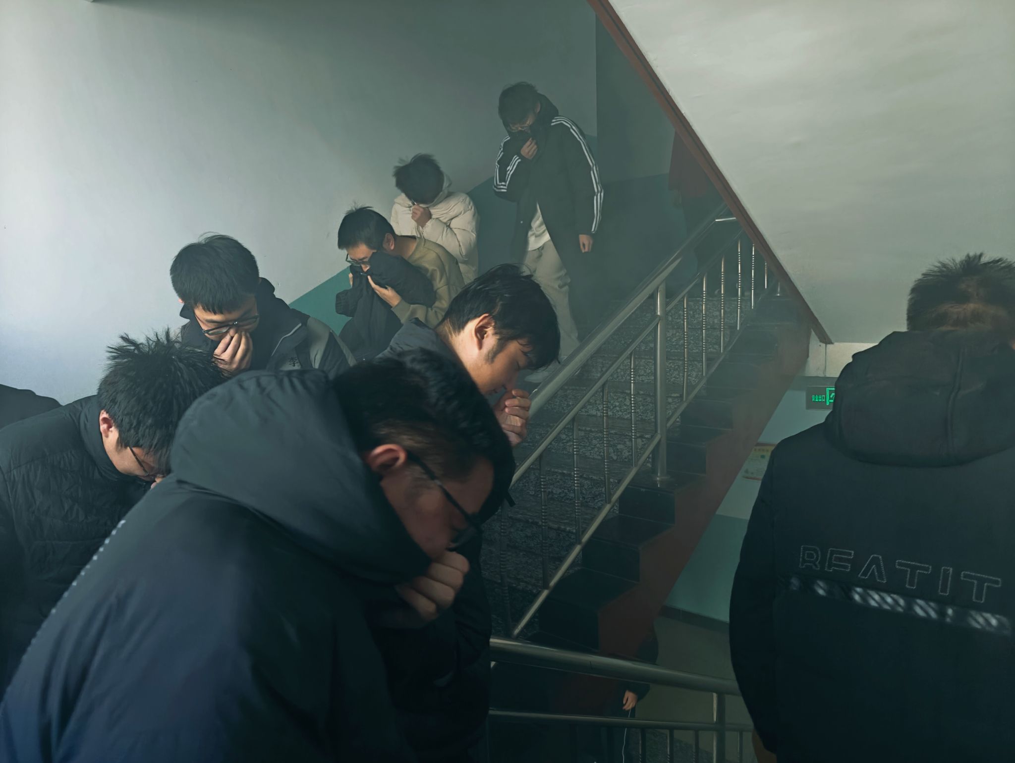 2024年11月28日下午3:00,随着消防警报响起,演练正式开始。出席演练活动的院领导陈伟书记带领辅导员王来老师和各楼层层长迅速到达指定点位,同学们手捂口鼻、低头弯腰,奔向宿舍门口,按照预定疏散路线有序撤离出宿舍楼,整个过程用时五分钟。在疏散过程中,大家安静、快速、有序撤离,没有出现拥挤、推搡、踩踏等意外情况。