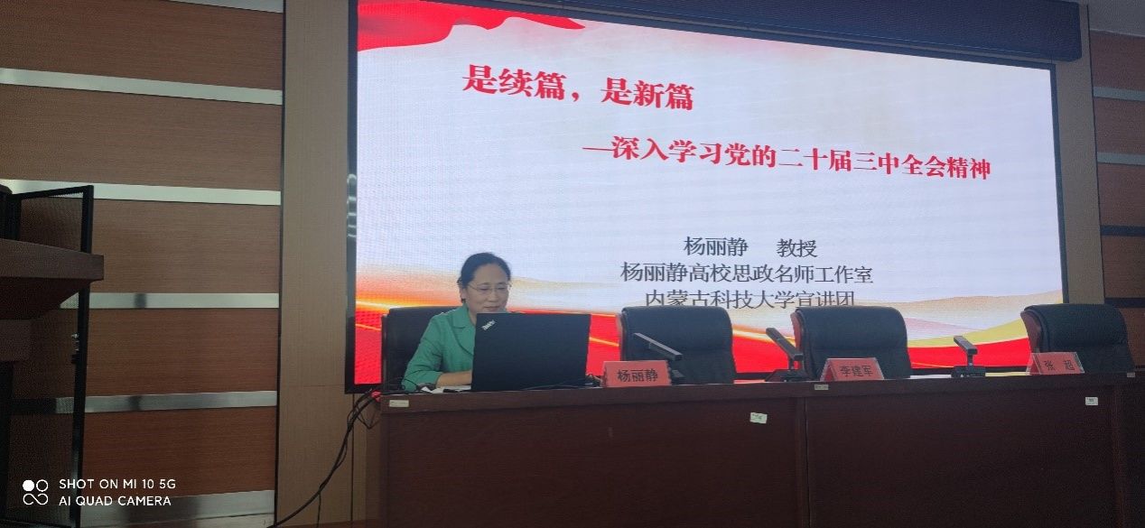 杨丽静教授从二十届三中全会总体概况、深入学习《决定》续篇党的改革开放事业、深入学习《决定》提出的新思想、新观点、新论断、践行《决定》精神书写中国式现代化内蒙古新篇章四个方面对二十届三中全会进行讲解,从理论高度和实践深度出发,引导广大教工和员工党员全面把握会议精神的实质和内涵,明确未来的发展方向和目标。