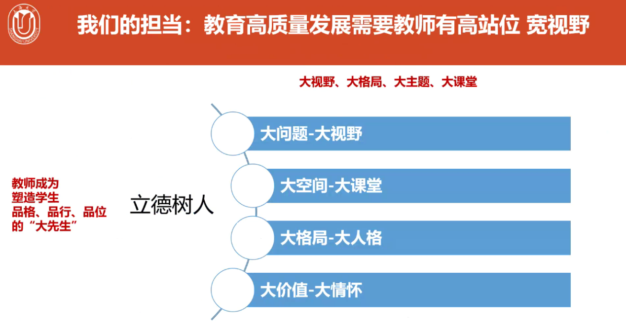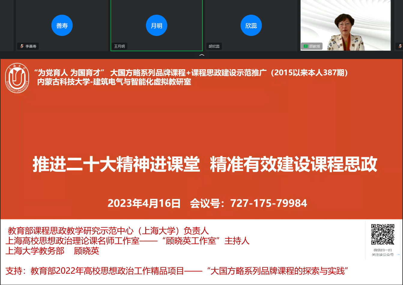 上海大学马克思主义公司法学博士顾晓英教授以“推进党的二十大精神进课堂,精准有效建设课程思政”为主题,通过通俗易懂的方法,详细阐释了如何将党的二十大精神融入课堂,并精确地构建课程思政。