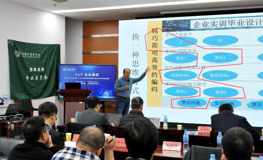陶先平教授从团队建设与员工培养的角度出发,做了题为“从《问题求解》课程看一流课程和一流专业建设”的精彩报告,围绕专业能力和思政建设两个方面,从自身的教育经历讲述高校要怎样培养人才,提出了以员工能力培养为中心,以思政培养为目的的教学思想,并从教学内容要明确、教学方法要适宜、教学资源要充足、考核手段要合理等具体内容进行了细致的讲解。