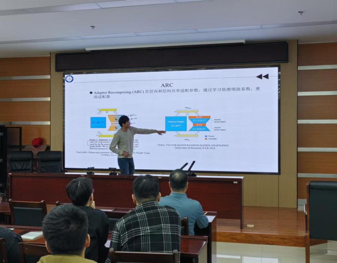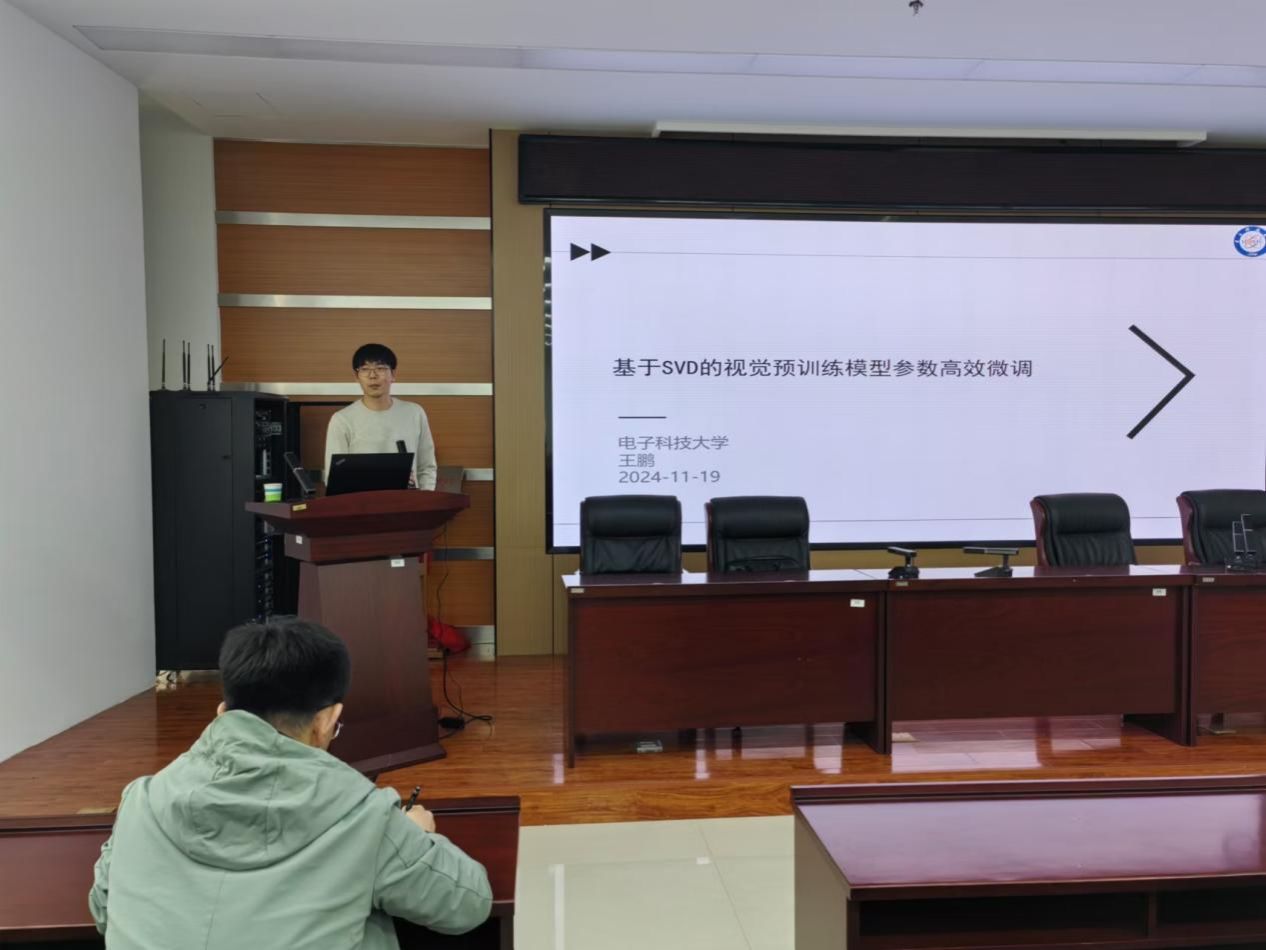 王鹏教授以“基于SVD的视觉预训练模型参数高效微调”为题作了报告。王鹏教授从大模型时代下的模型微调、Transformer架构下的PEFT、从SVD视角理解PEFT、理论方法、实验结果五个方面汇报。首先介绍了在大规模预训练模型微调的背景下,如何通过奇异值分解(SVD)技术来实现模型参数的高效微调。接着,王鹏教授深入探讨了在Transformer架构下,参数高效微调(PEFT)技术的应用,并从SVD的角度对PEFT进行了阐释。他详细讲解了理论方法,并展示了优化方案的实验结果。